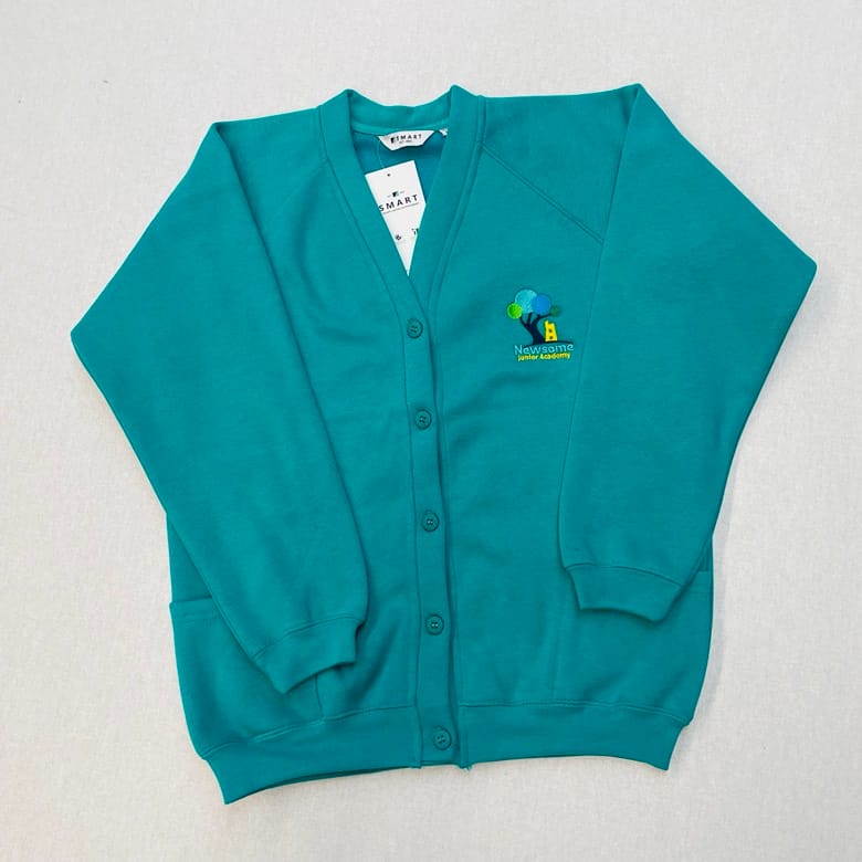 Cardigan in Jade colour with new school logo to front and Year 6 logo to the back
